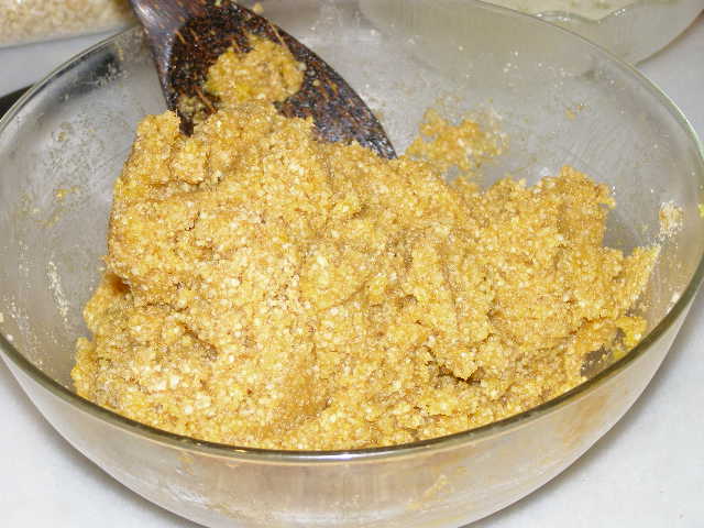Separa la yema de dos huevos de las claras, reserva estas y vierte las yemas en la mezcla anterior removiendo para que se mezclen todos los ingredientes. Pon en platitos y por separado la almendra picada, los piñones y un tercio del coco.