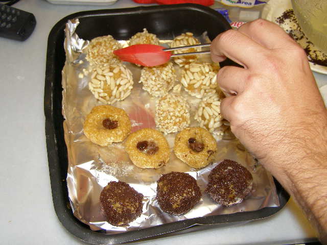 Enciende el horno con el grill a 170º C para que se vaya calentando. Prosigue con la preparación de los panellets, forma bolitas con la masa de coco y rebózalas con el coco rallado del platito, deposítalos también en la bandeja.